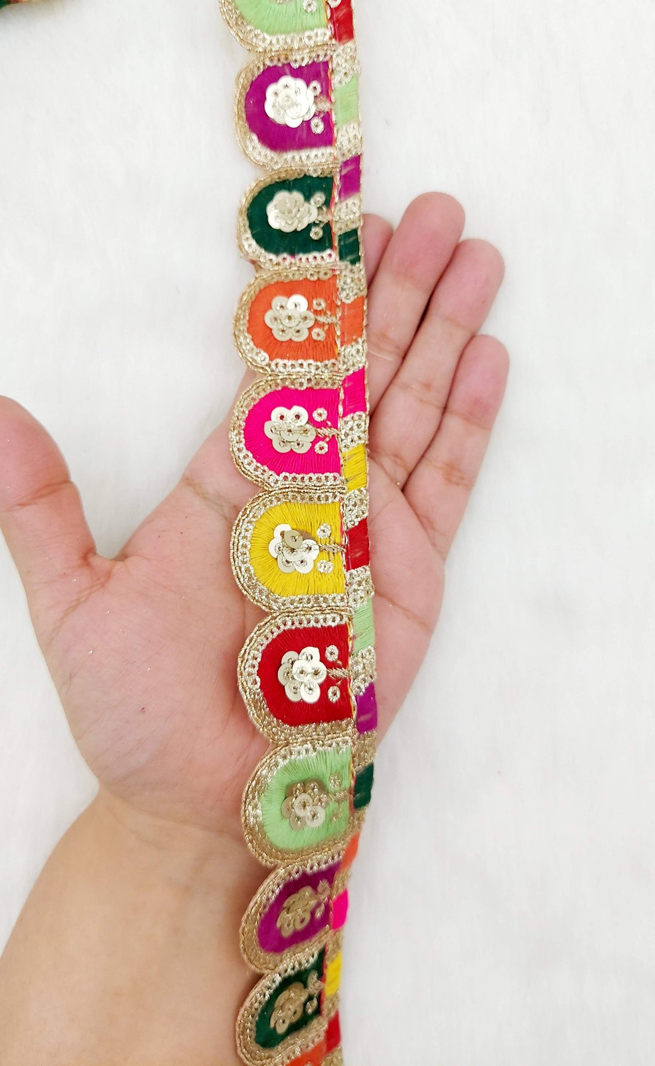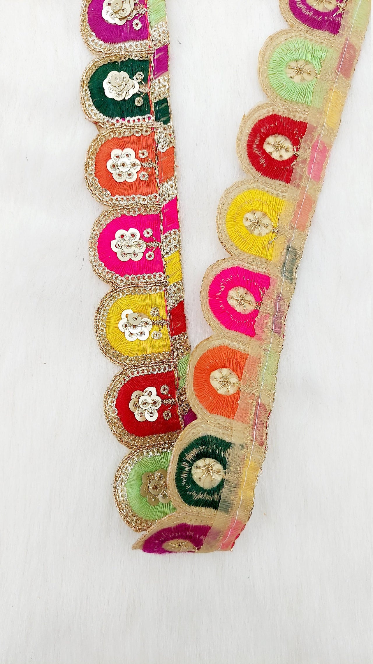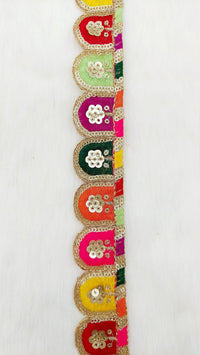 Multicoloured Scalloped Lace Trim with Gold Sequins Embroidery, Fringe Lace Trim, Sari Trimming
