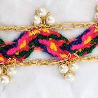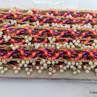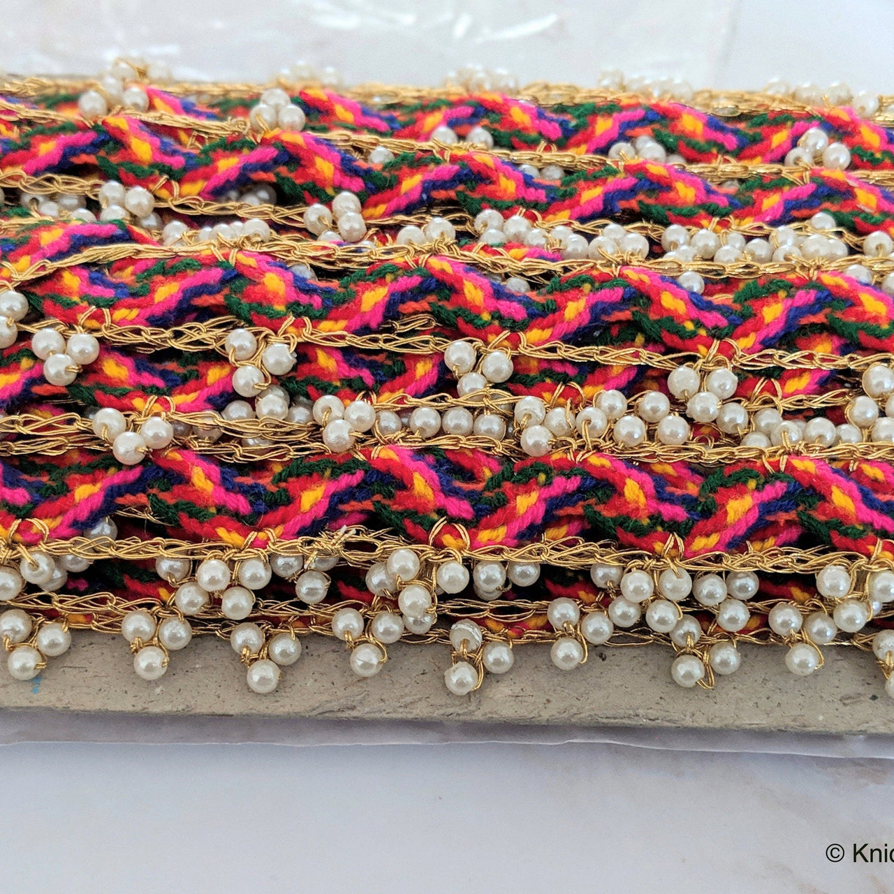 Multicoloured Wool Woven Trim With Gold Piping and Off White Pearl Beads, Approx. 40mm Wide - 010518L6