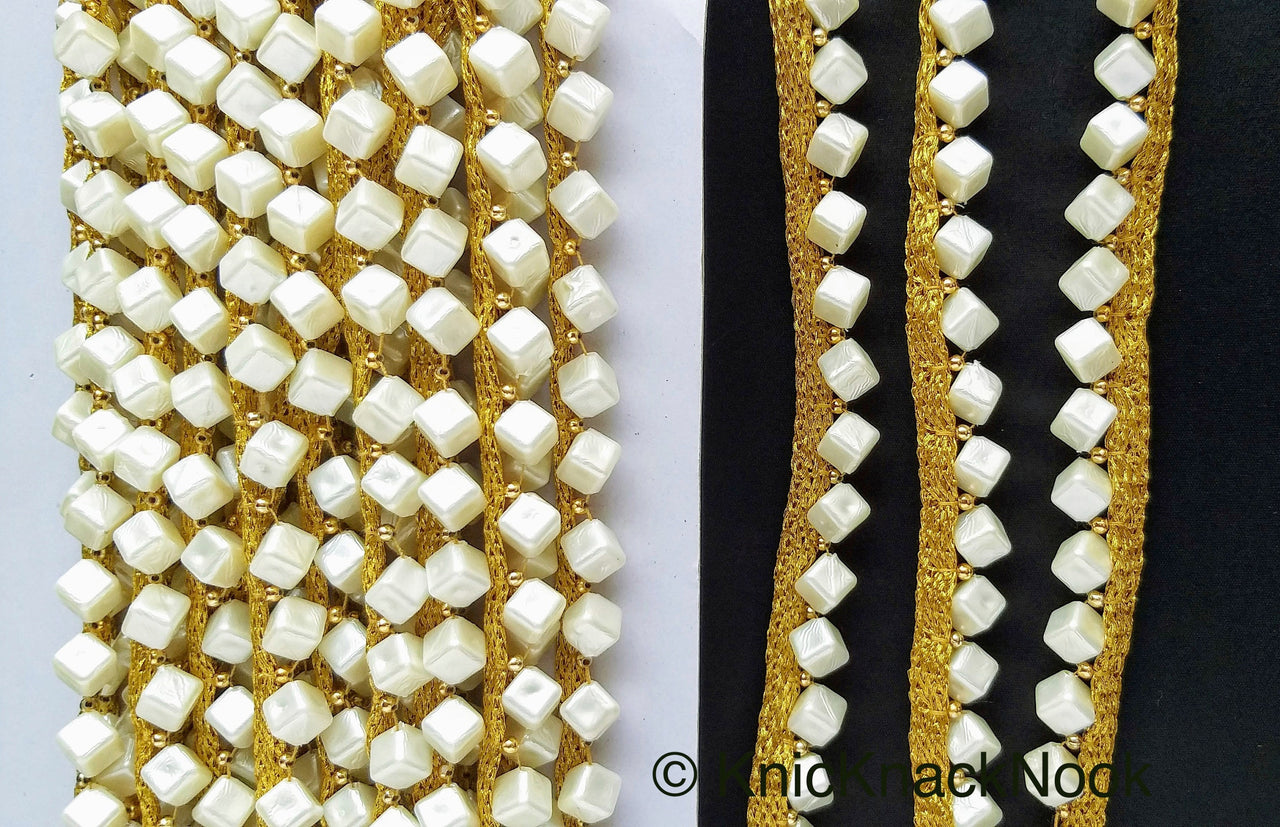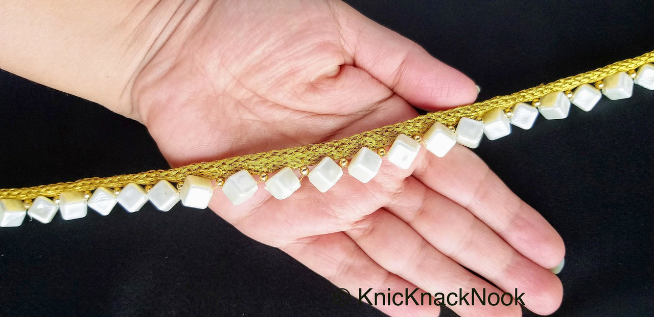 Off White Cube Pearls Beads With Gold Fringe Woven Trim, One Yard 12mm wide