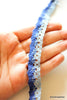 The embroidery on this trim is called Zardozi, an exclusive type of embroidery that is done by hand. Zardozi comes from two Persian words: zar or zarin meaning 'gold', and dozi meaning 'sewing'. Zardozi is a type of heavy and elaborate metal embroidery on a silk, satin, or velvet fabric base.