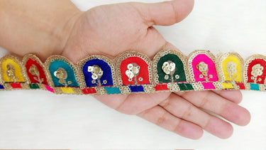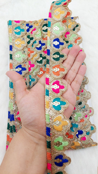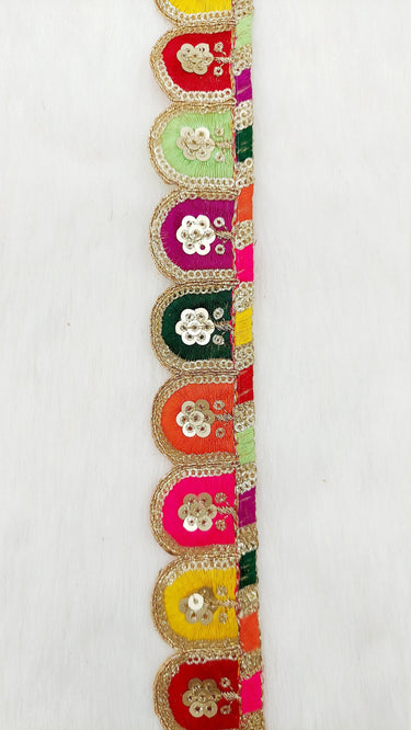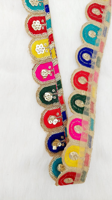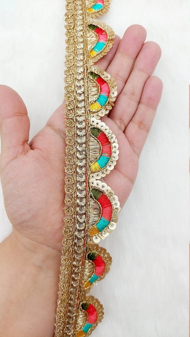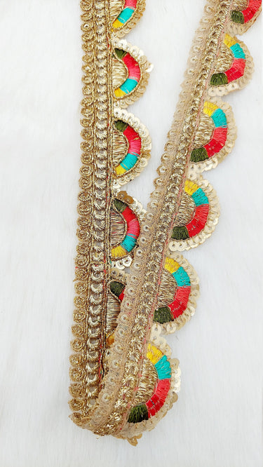 This listing is for Multicoloured Scalloped Lace Trim with Gold Sequins Embroidery, Fringe Lace Trim, Sari Trimming, Decorative Trim, 9 Yards.