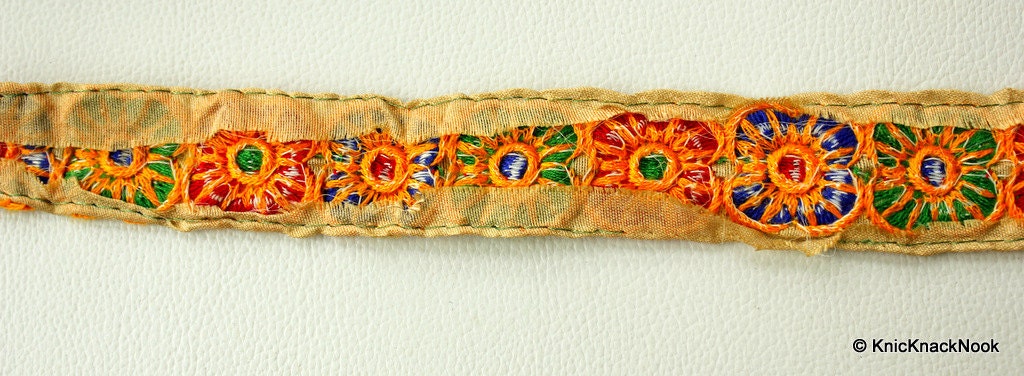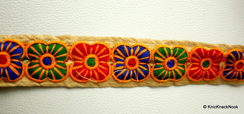 Beige Fabric Trim With Red, Blue, Green And Yellow Floral Embroidery