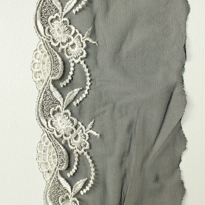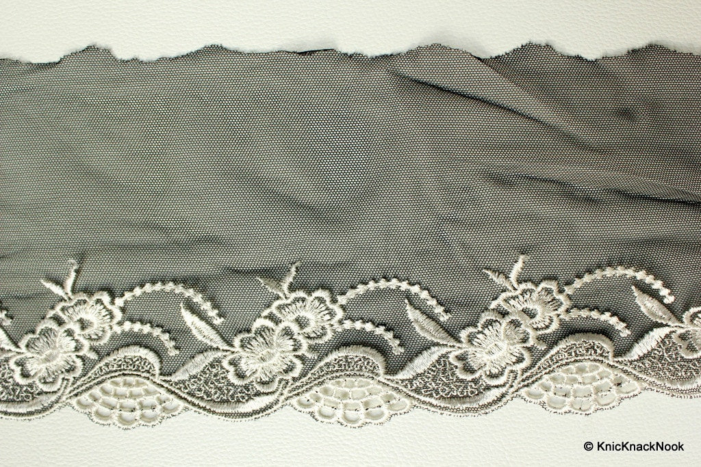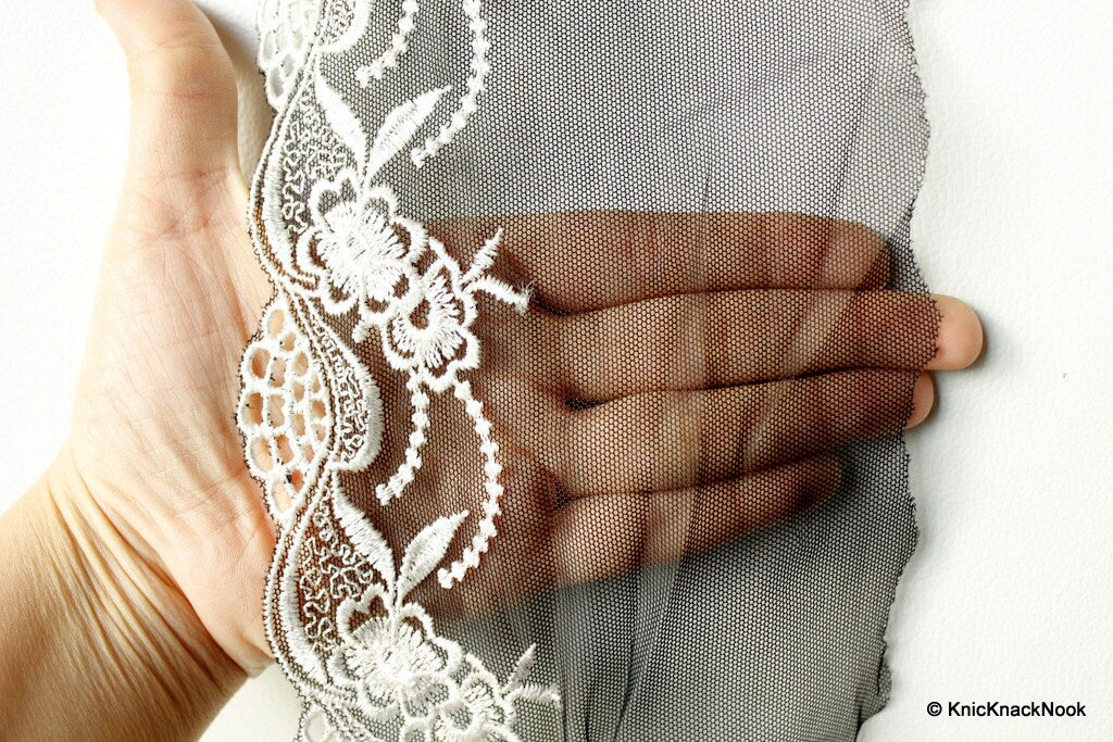 Black Soft Net Lace Trim with White Embroidered Flowers 5 1/2 inches wide