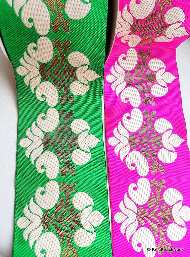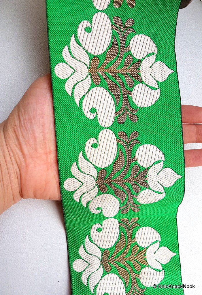 Green Fabric Trim With Beige And Gold Thread Embroidery, Approx. 10.3cm Wide