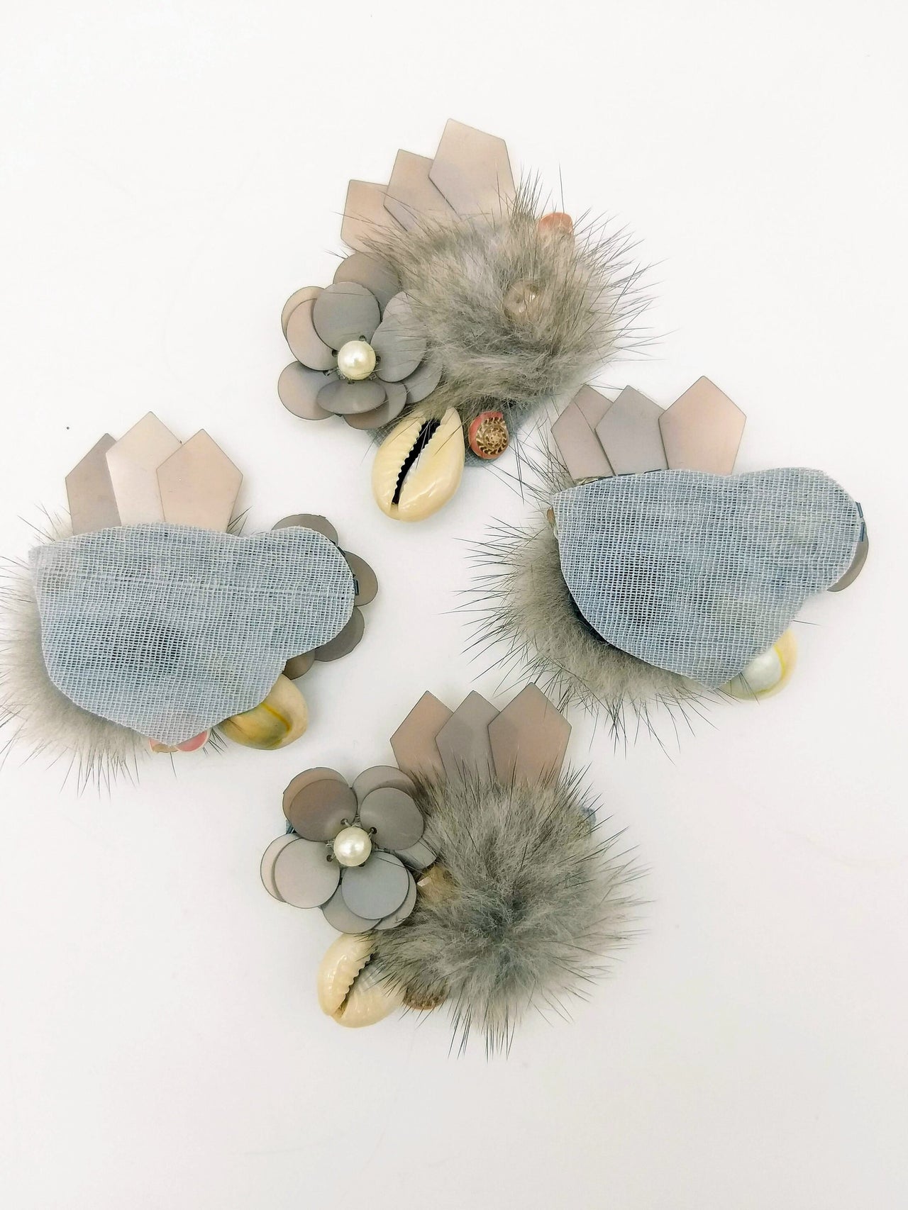 Hand Embroidered Grey Applique With Cowrie Shell, Sequins,Pearl and Feather Pom Pom