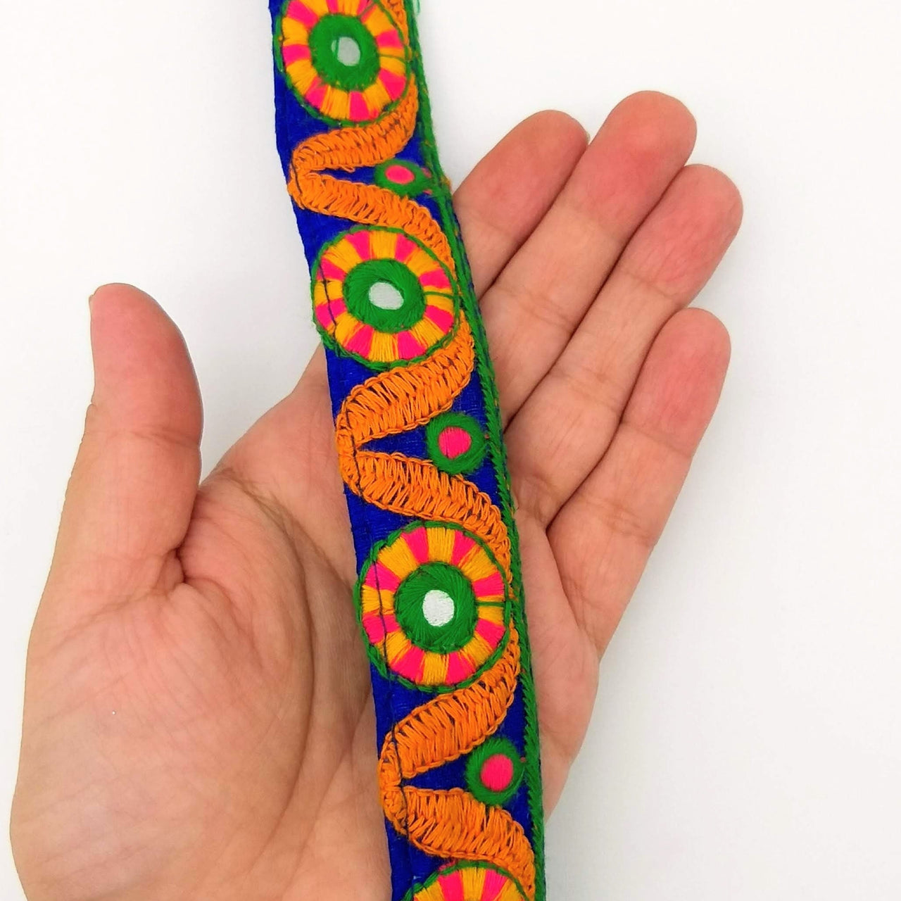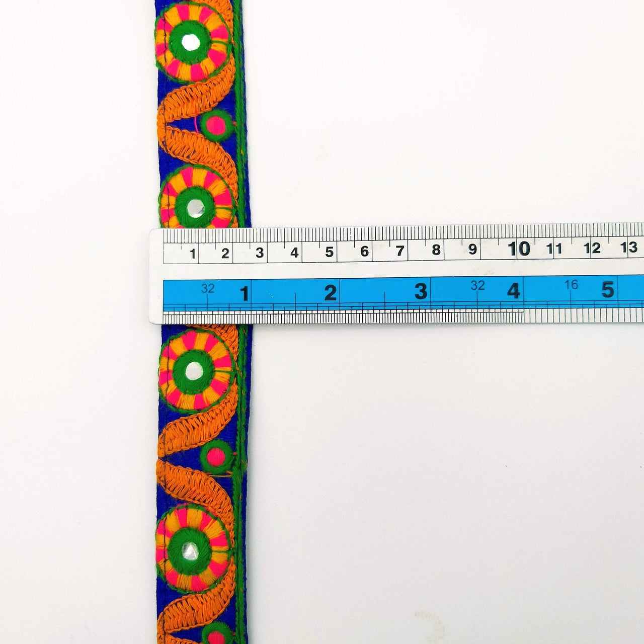 This listing is for a lovely Royal Blue Mirrored Fabric Trim With Orange, Yellow, Green And Pink Embroidery, Approx. 26mm Wide, Trim By Yard, Embroidered Trimming.