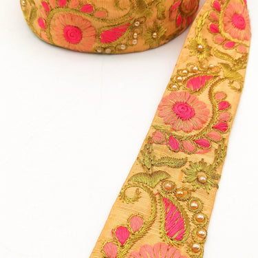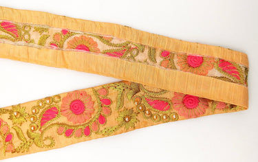 This listing is for a lovely Peach Art Silk Lace Trim, Floral Embroidery in Pink, Fuchsia and Gold, Hand Embroidered Border, Trim By Yard.