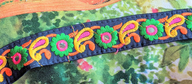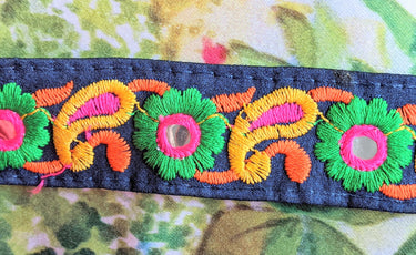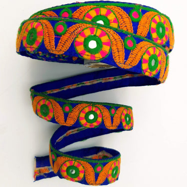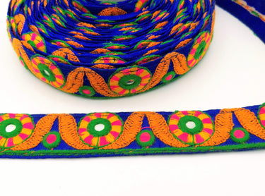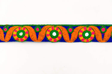This listing is for a lovely Royal Blue Mirrored Fabric Trim With Orange, Yellow, Green And Pink Embroidery, Approx. 26mm Wide, Trim By Yard, Embroidered Trimming.