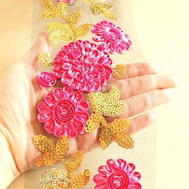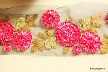 This listing is for a lovely Black Net Lace Trim With Pink Satin Flowers And Sequin Work.