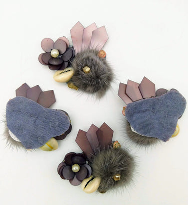 Hand Embroidered Metallic Grey Applique With Cowrie Shell, Sequins,Pearl and Feather Pom Pom.
