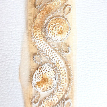 This listing is for a lovely Beige Net Lace Trim With Silver Embroidery And Gold Sequins.
