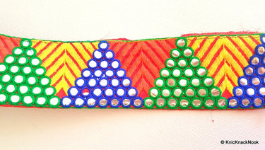 This listing is for a lovely Red Mirrored Fabric Trim With Yellow, Orange , Green And Blue Threadwork With Mirrors. The embroidery work with mirrors on this trim is a speciality of Indian workmanship and is called as 'Abla Work' Or 'Shisha Work'. This is a very unique fabric trim and a special KnicKnackNook find which you will not find anywhere else.