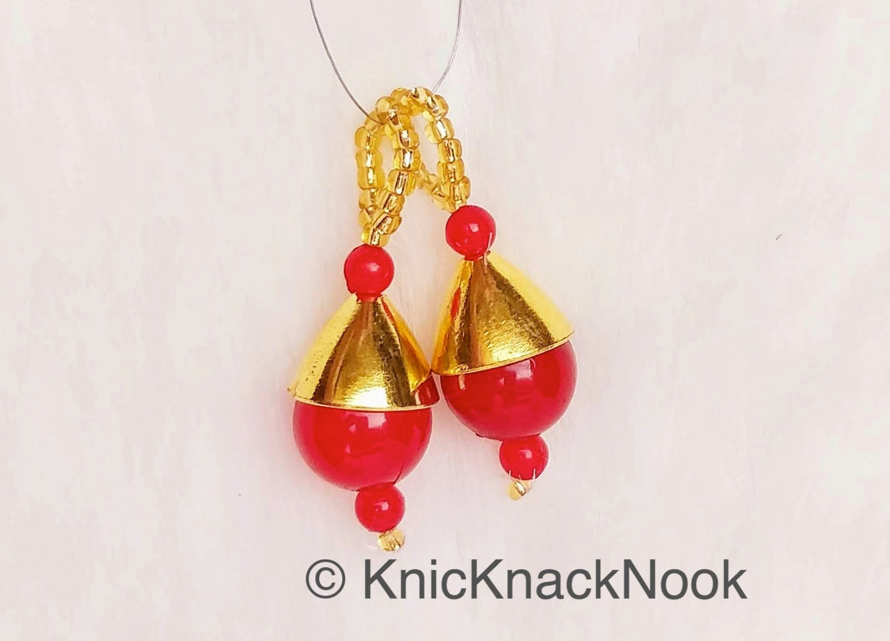 Red Bead Tassels Latkan, Indian Antique Distressed Latkans, Gold Beaded Danglers