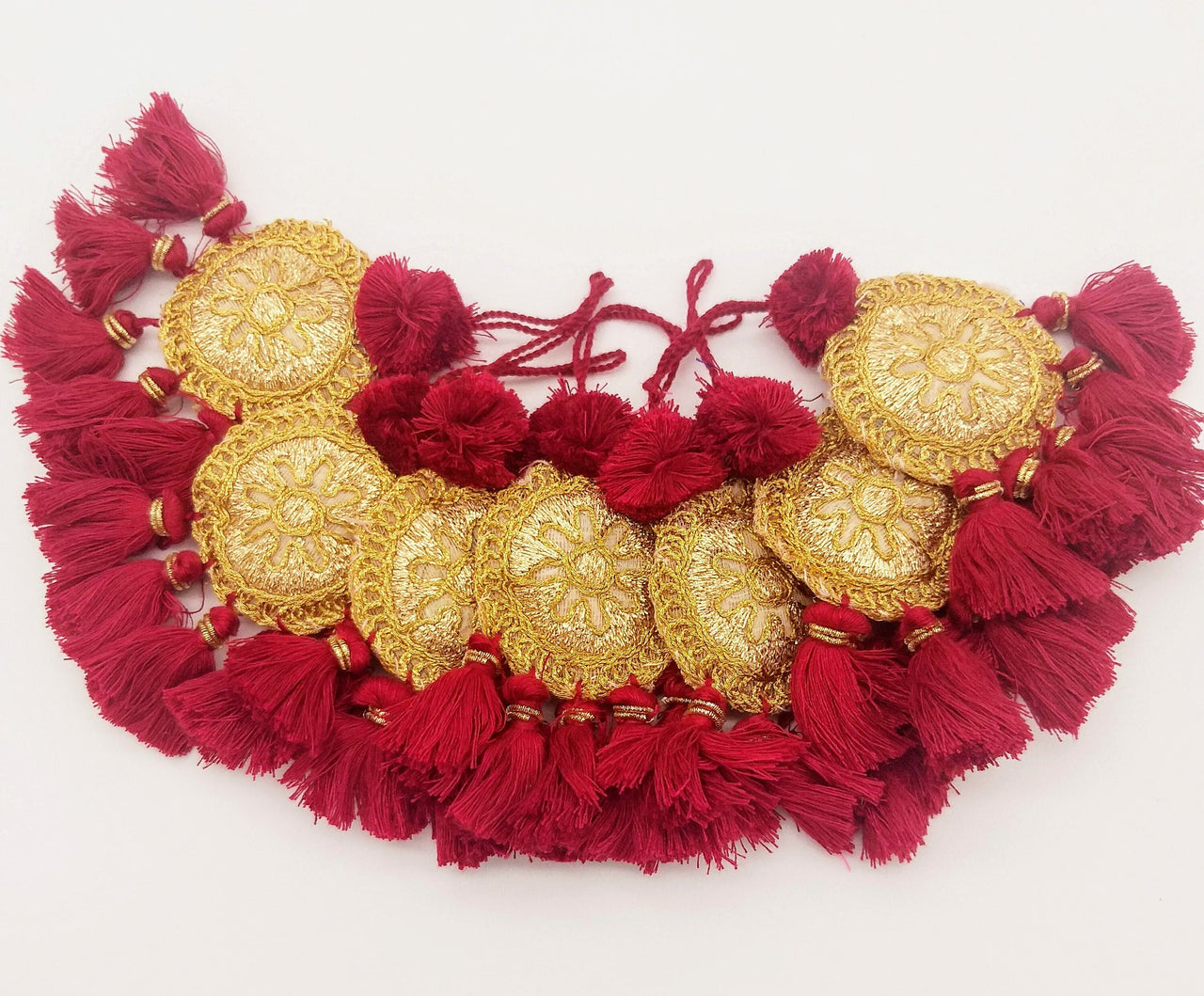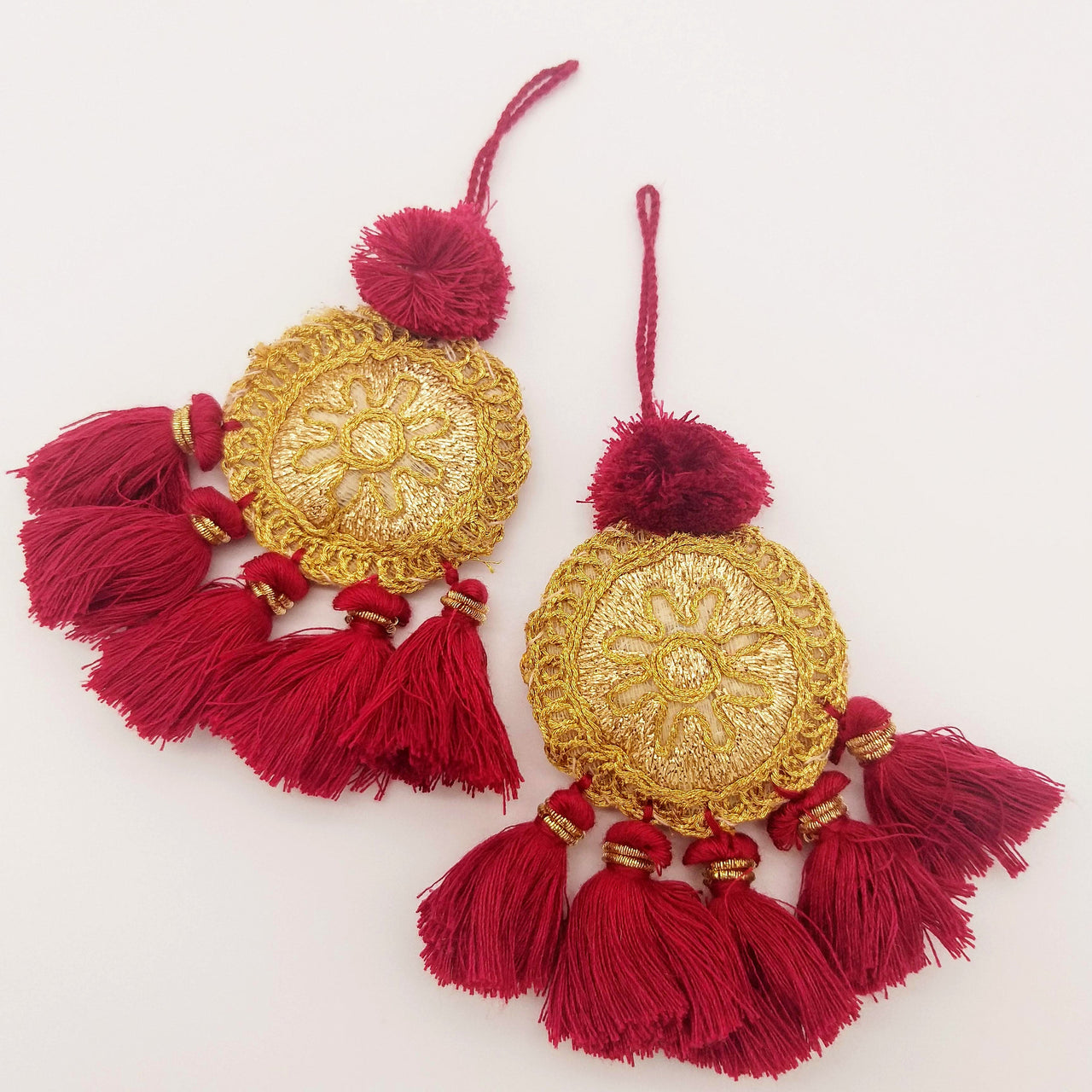 Set of 2 Embroidered Tassels, Maroon Red and Gold Tassels, Indian Tassels