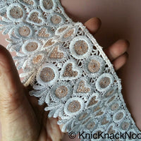 Silver, White And Brown Circle And Heart Embroidered Cotton And Shimmer Thread Zari Lace Trim, Approx. 90mm wide - 200317L79