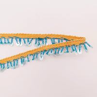 The embroidery on this trim is called Zardozi, an exclusive type of embroidery that is done by hand. Zardozi comes from two Persian words: zar or zarin meaning 'gold', and dozi meaning 'sewing'. Zardozi is a type of heavy and elaborate metal embroidery on a silk, satin, or velvet fabric base.