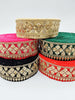 The embroidery on this trim is called Zardozi, an exclusive type of embroidery that is done by hand. Zardozi comes from two Persian words: zar or zarin meaning 'gold', and dozi meaning 'sewing'. Zardozi is a type of heavy and elaborate metal embroidery on a silk, satin, or velvet fabric base.