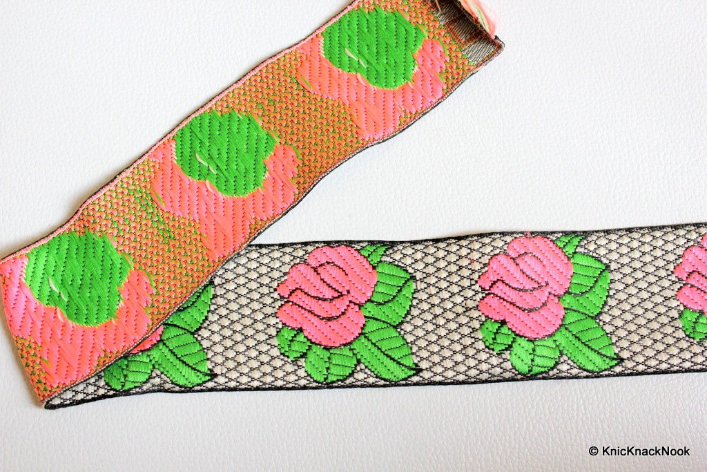 Wholesale Black And White Lace With Pink Rose And Green Leaves Floral Trim, Approx. 47mm wide Rose Jacquard Trim Wholesale Trim By 9 Yards