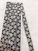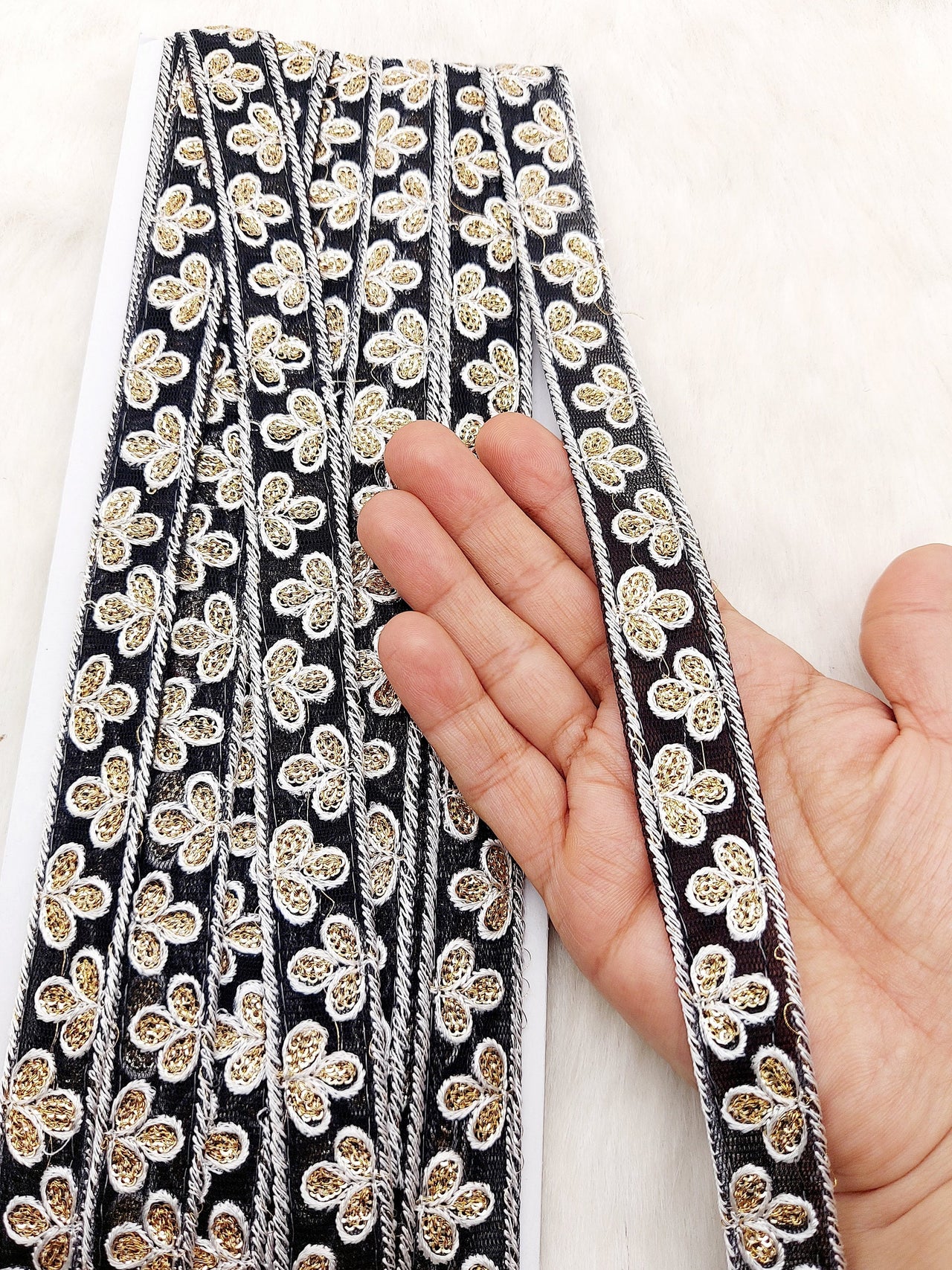 The embroidery on this trim is called Zardozi, an exclusive type of embroidery that is done by hand. Zardozi comes from two Persian words: zar or zarin meaning 'gold', and dozi meaning 'sewing'. Zardozi is a type of heavy and elaborate metal embroidery on a silk, satin, or velvet fabric base.