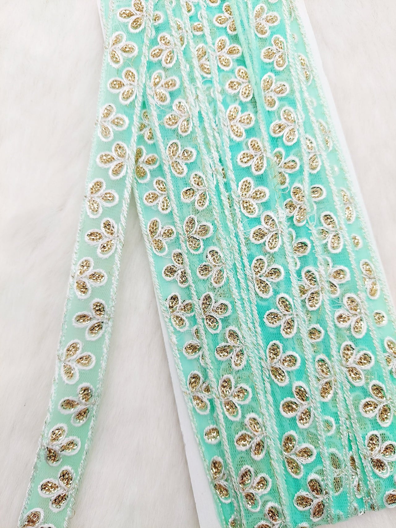 Wholesale Mint Green Net Lace Floral Embroidery & Glitter Gold Sequins, Indian Wedding Border, Gifting Ribbon Costume Trim Fashion Trimming