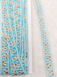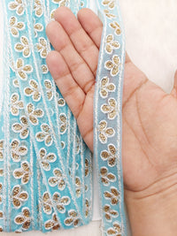 Wholesale Sky Blue Net Lace Floral Embroidery & Glitter Gold Sequins, Indian Wedding Border, Gifting Ribbon Costume Trim Fashion Trimming