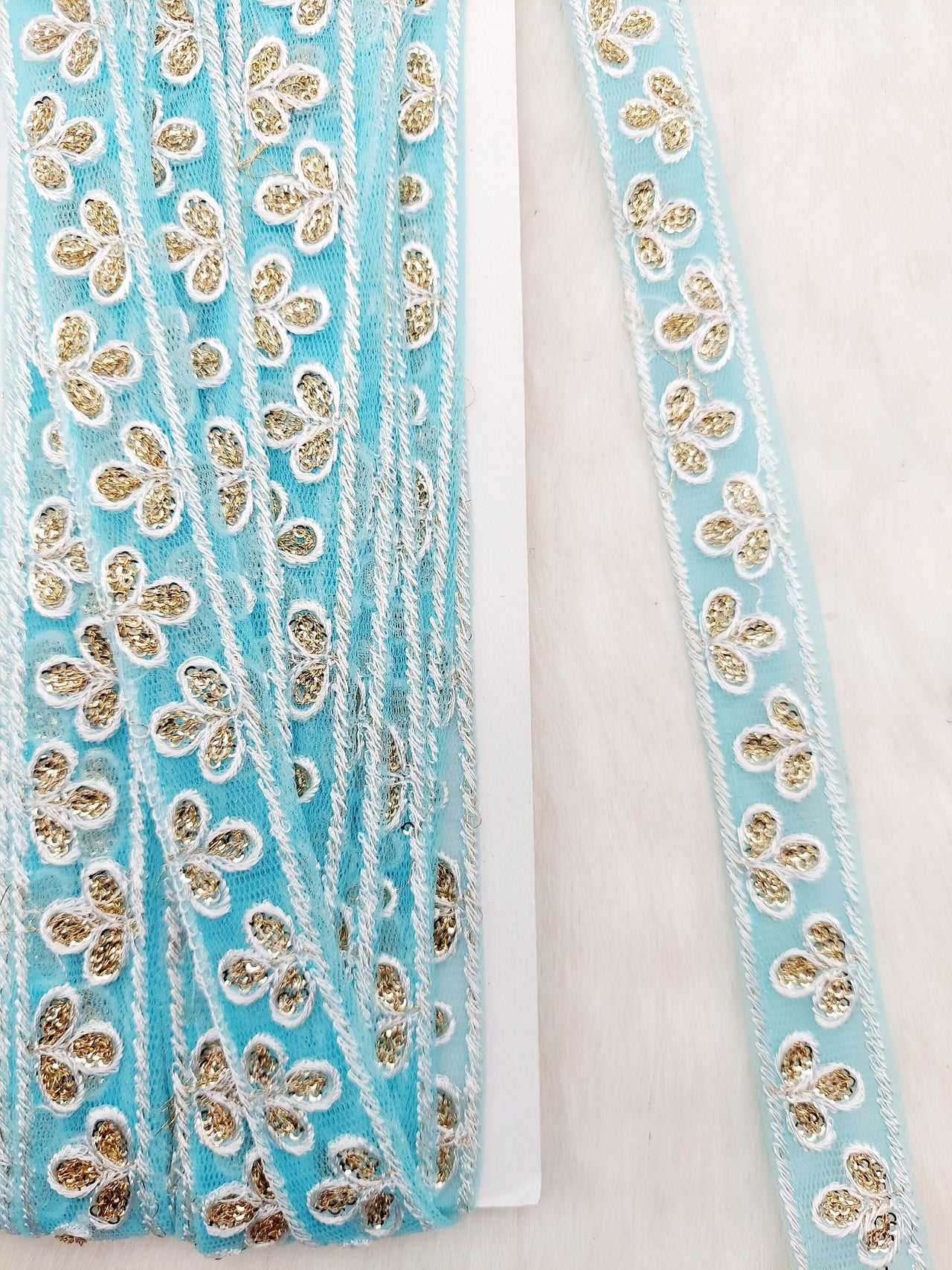 This listing is for a lovely Wholesale Sky Blue Net Lace Trim Floral Embroidery & Glitter Gold Sequins, Indian Wedding Border, Gifting Ribbon Costume Trim Fashion Trimming
