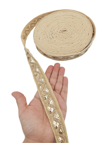 This listing is for a lovely Wholesale Beige Net Lace Trim Floral Embroidery & Glitter Gold Sequins, Indian Wedding Border, Gifting Ribbon Costume Trim Fashion Trimming