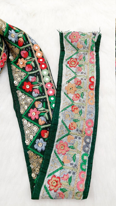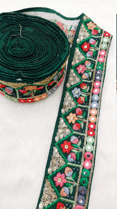 This listing is for a lovely Floral Embroidered Velvet Trim Indian Sari Border, Sequin Trimming, Sequinned Lace, Trim By 9 Yards, Foil Mirror Trim.