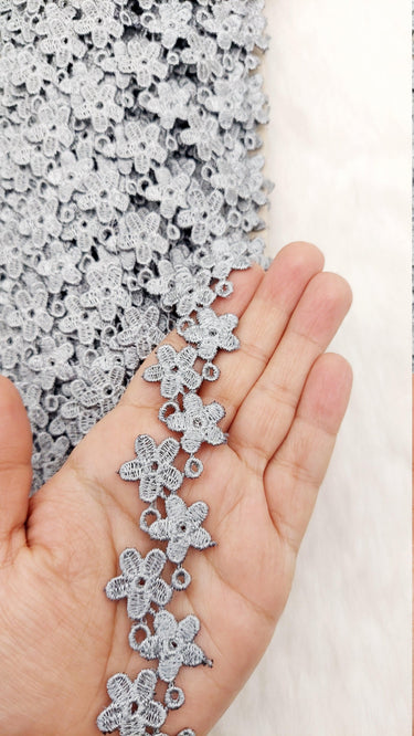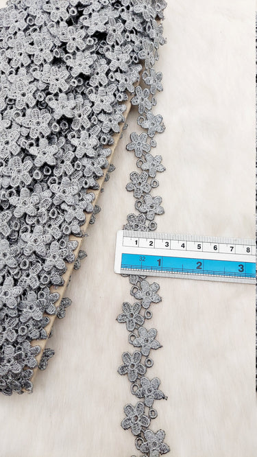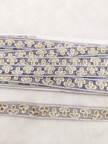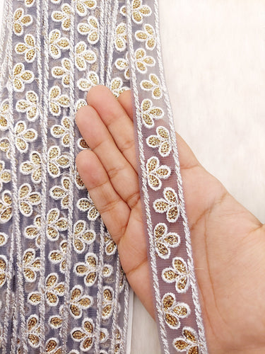 This listing is for a lovely Wholesale Grey Net Lace Trim Floral Embroidery & Glitter Gold Sequins, Indian Wedding Border, Gifting Ribbon Costume Trim Fashion Trimming