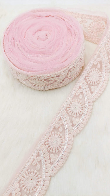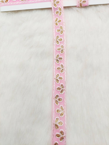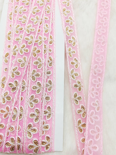 This listing is for a lovely Wholesale Pink Net Lace Trim Floral Embroidery & Glitter Gold Sequins, Indian Wedding Border, Gifting Ribbon Costume Trim Fashion Trimming