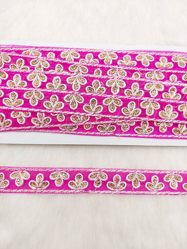 This listing is for a lovely Wholesale Fuchsia Net Lace Trim Floral Embroidery & Glitter Gold Sequins, Indian Wedding Border, Gifting Ribbon Costume Trim Fashion Trimming