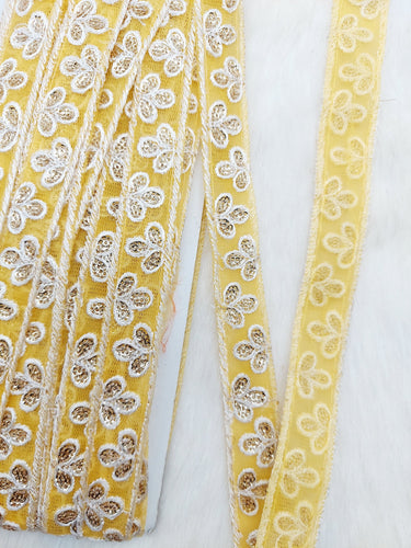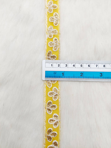 This listing is for a lovely Wholesale Yellow Net Lace Trim Floral Embroidery & Glitter Gold Sequins, Indian Wedding Border, Gifting Ribbon Costume Trim Fashion Trimming