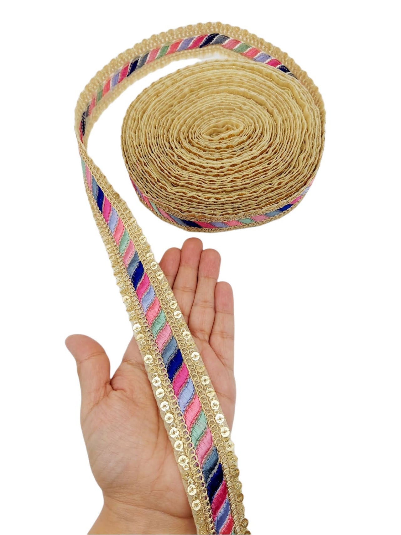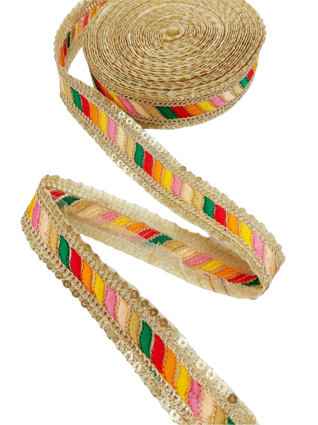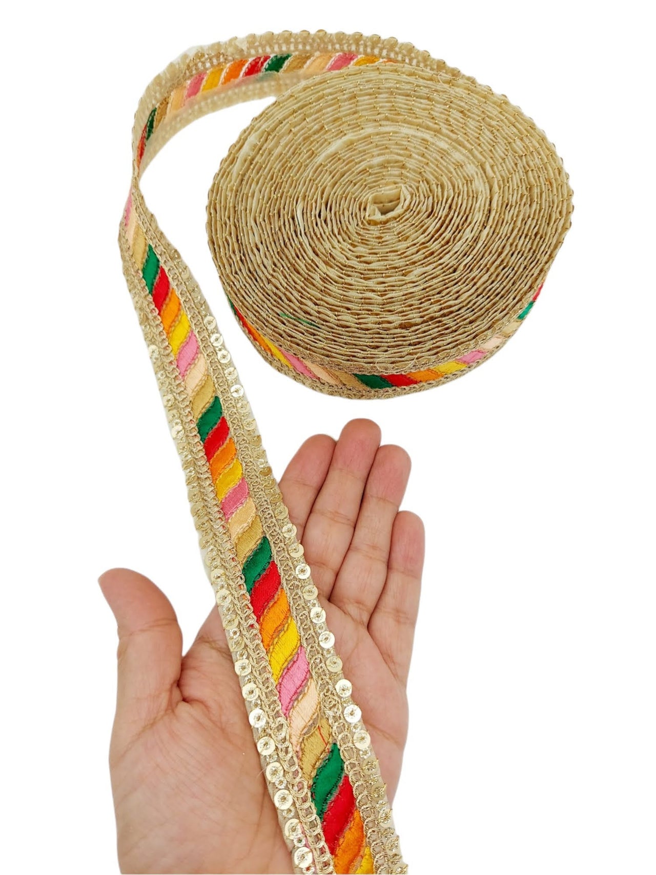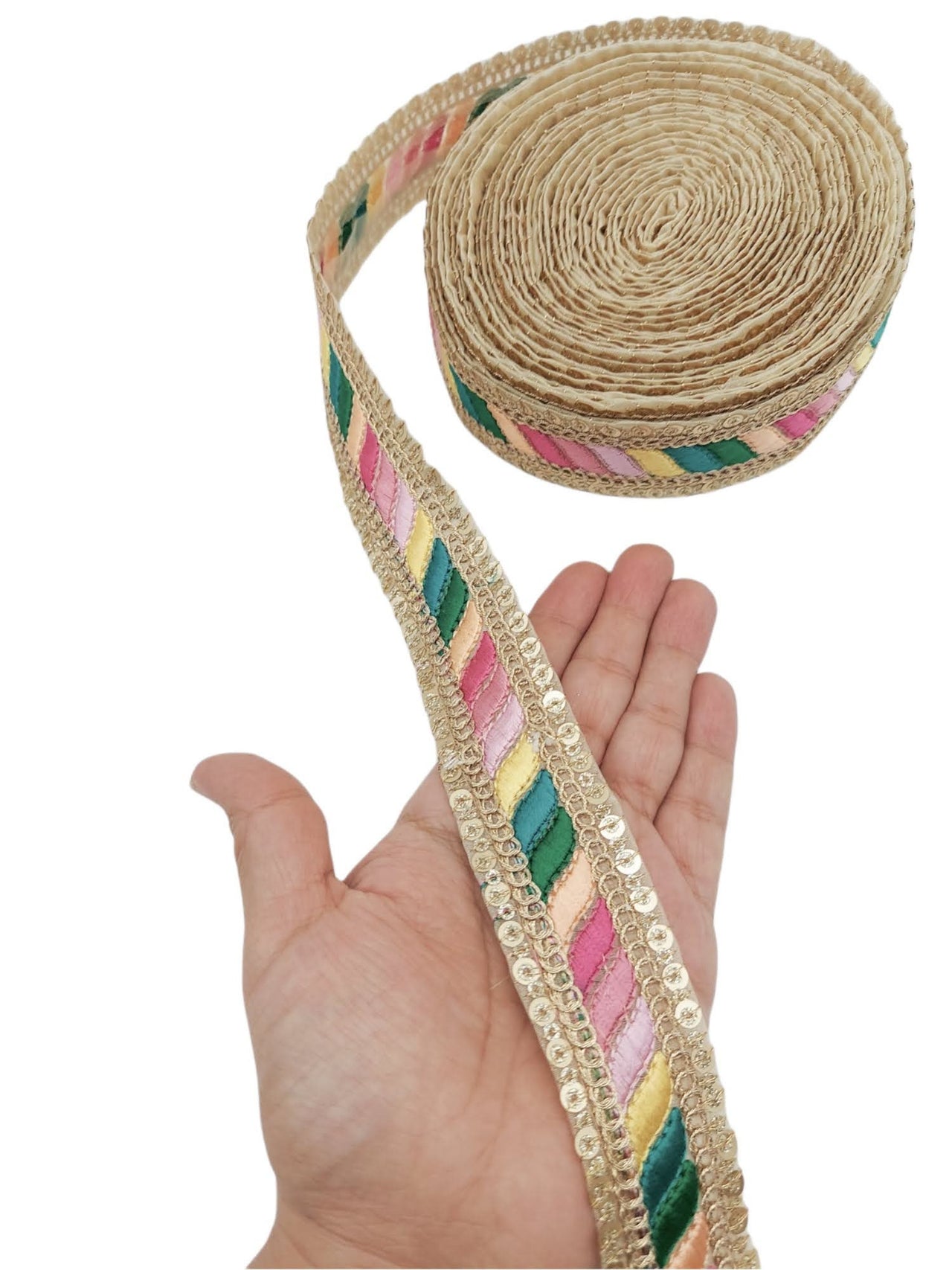 The embroidery on this trim is called Zardozi, an exclusive type of embroidery that is done by hand. Zardozi comes from two Persian words: zar or zarin meaning 'gold', and dozi meaning 'sewing'. Zardozi is a type of heavy and elaborate metal embroidery on a silk, satin, or velvet fabric base.