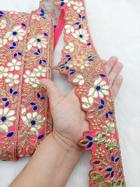 The embroidery on this trim is called Zardozi, an exclusive type of embroidery that is done by hand. Zardozi comes from two Persian words: zar or zarin meaning 'gold', and dozi meaning 'sewing'. Zardozi is a type of heavy and elaborate metal embroidery on a silk, satin, or velvet fabric base.