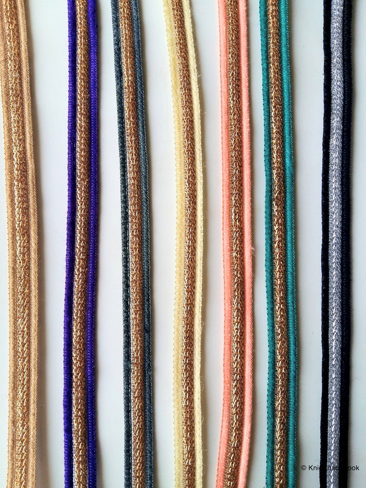 The embroidery on this trim is called Zardozi, an exclusive type of embroidery that is done by hand. Zardozi comes from two Persian words: zar or zarin meaning 'gold', and dozi meaning 'sewing'. Zardozi is a type of heavy and elaborate metal embroidery on a silk, satin, or velvet fabric base.