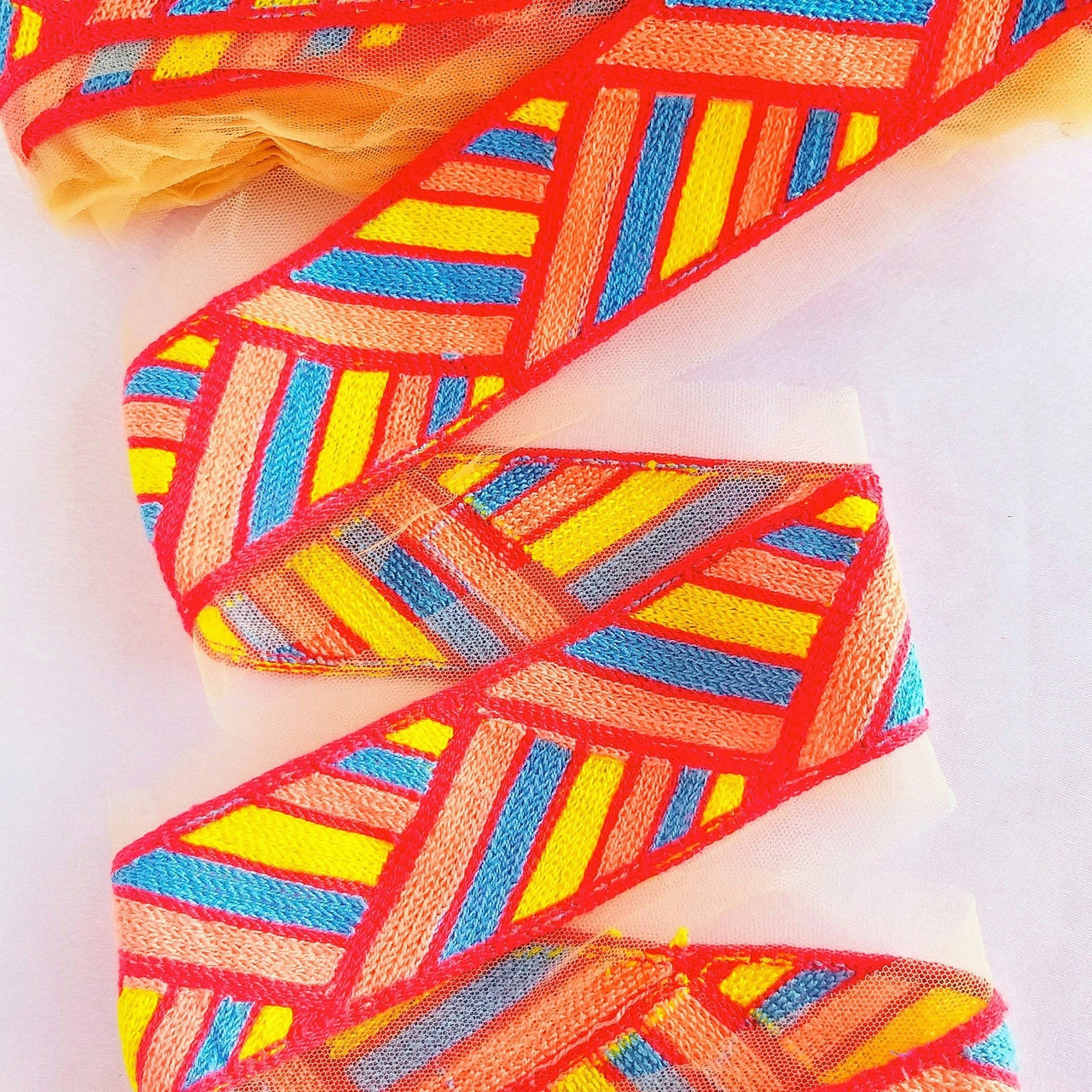 The embroidery on this trim is called Zardozi, an exclusive type of embroidery that is done by hand. Zardozi comes from two Persian words: zar or zarin meaning 'gold', and dozi meaning 'sewing'. Zardozi is a type of heavy and elaborate metal embroidery on a silk, satin, or velvet fabric base.