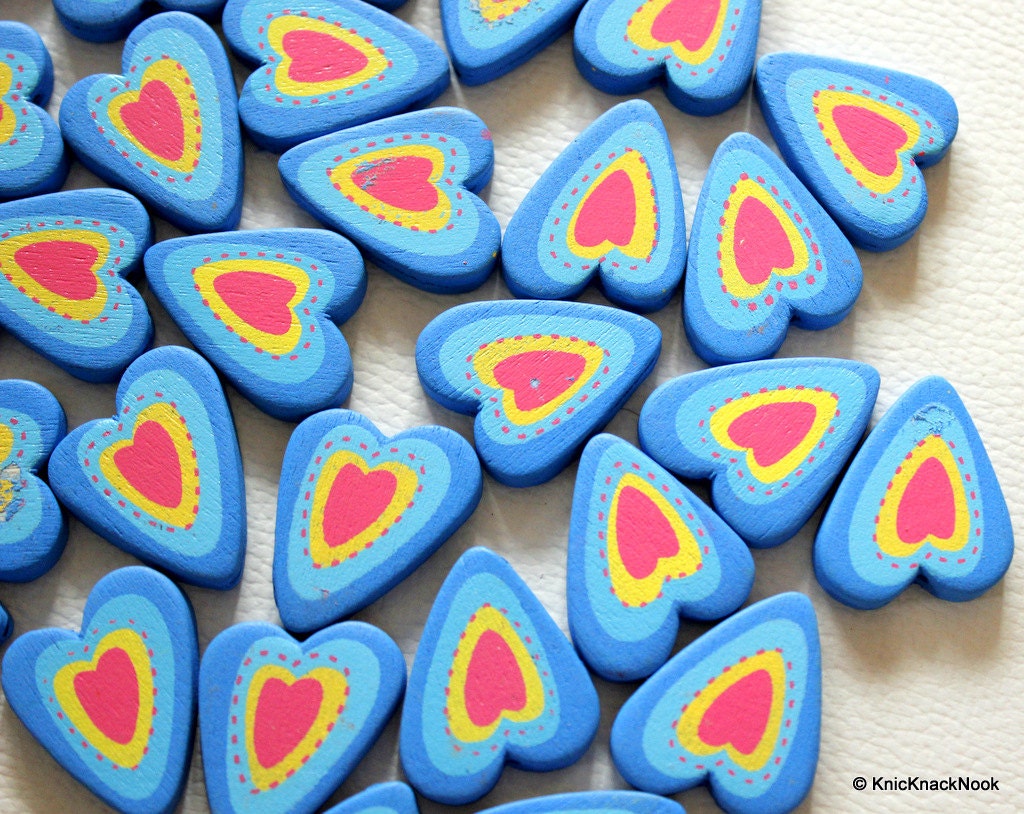 Blue, Yellow And Fuchsia Heart Wood Beads x 5