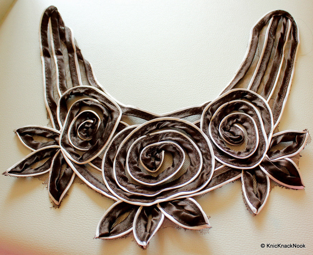 The embroidery on this trim is called Zardozi, an exclusive type of embroidery that is done by hand. Zardozi comes from two Persian words: zar or zarin meaning 'gold', and dozi meaning 'sewing'. Zardozi is a type of heavy and elaborate metal embroidery on a silk, satin, or velvet fabric base.