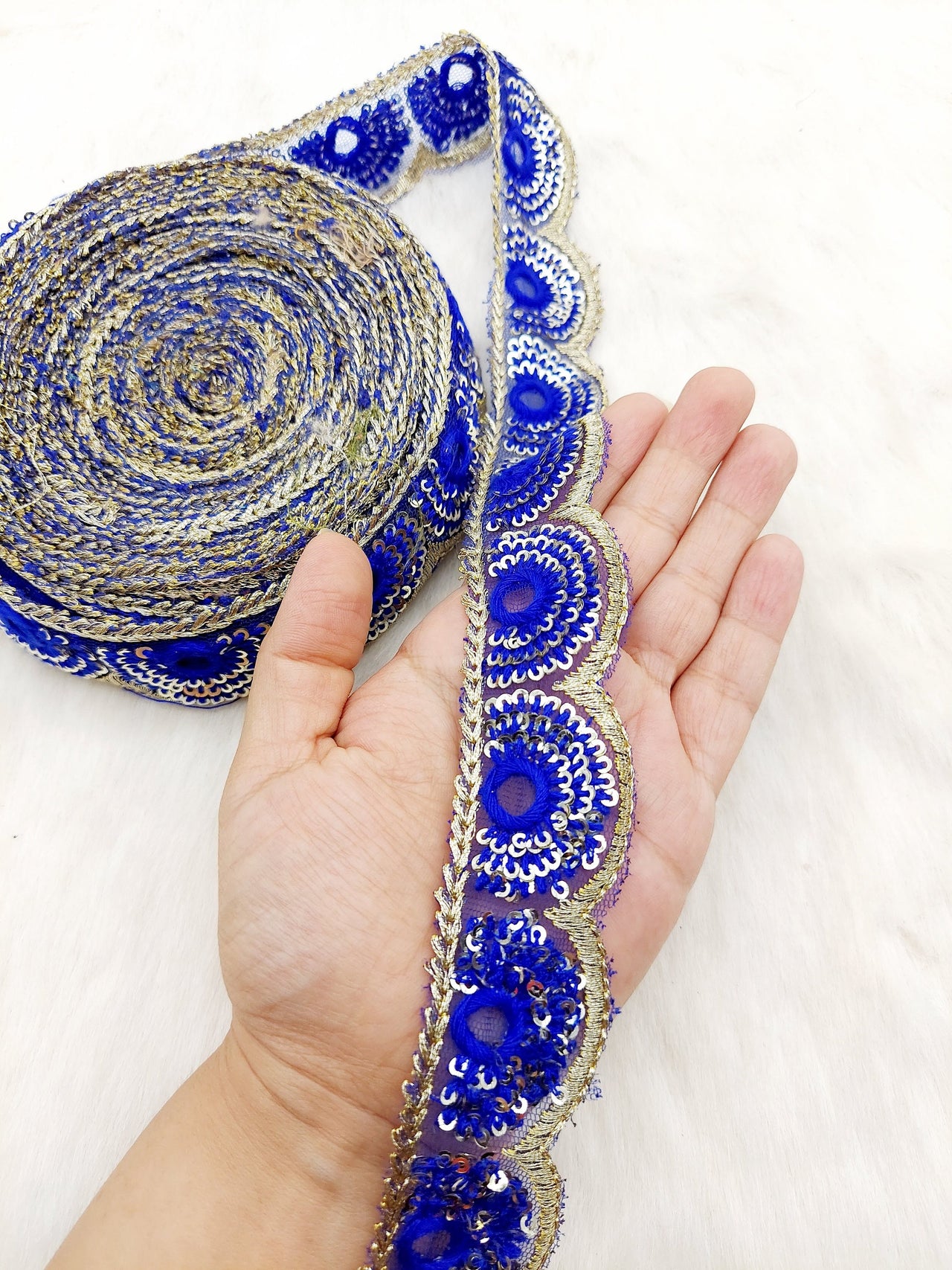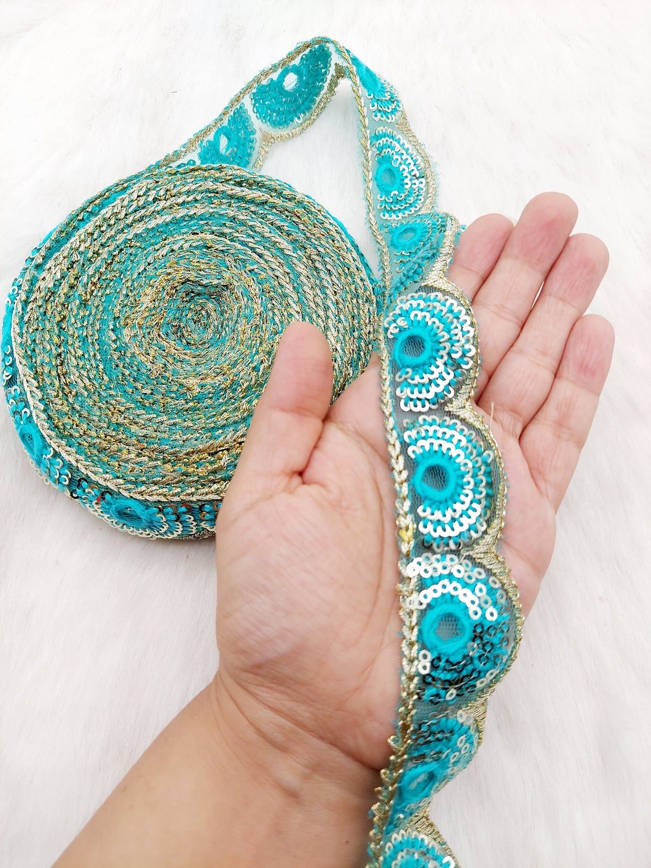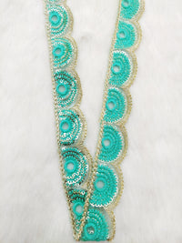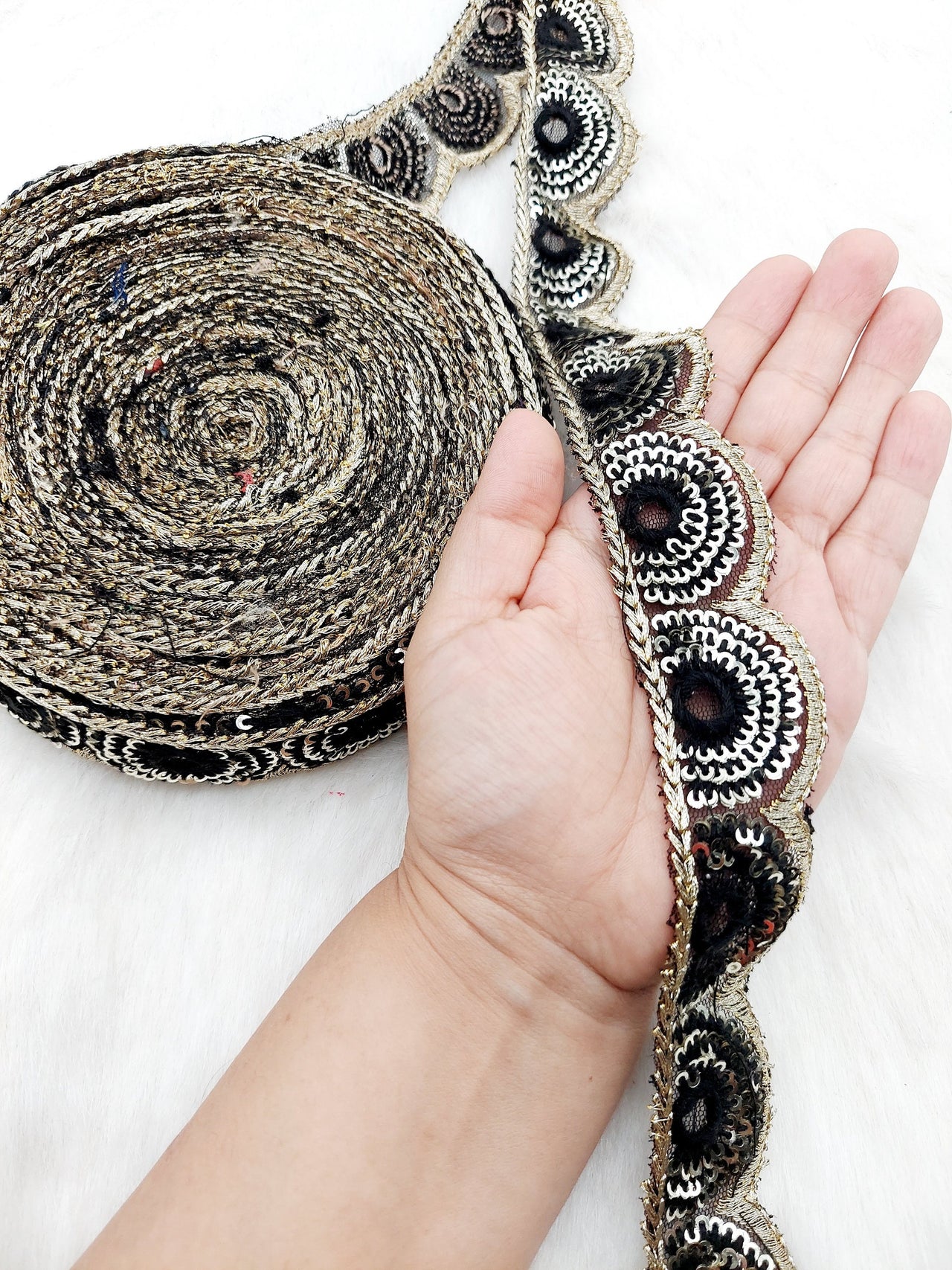 The embroidery on this trim is called Zardozi, an exclusive type of embroidery that is done by hand. Zardozi comes from two Persian words: zar or zarin meaning 'gold', and dozi meaning 'sewing'. Zardozi is a type of heavy and elaborate metal embroidery on a silk, satin, or velvet fabric base.