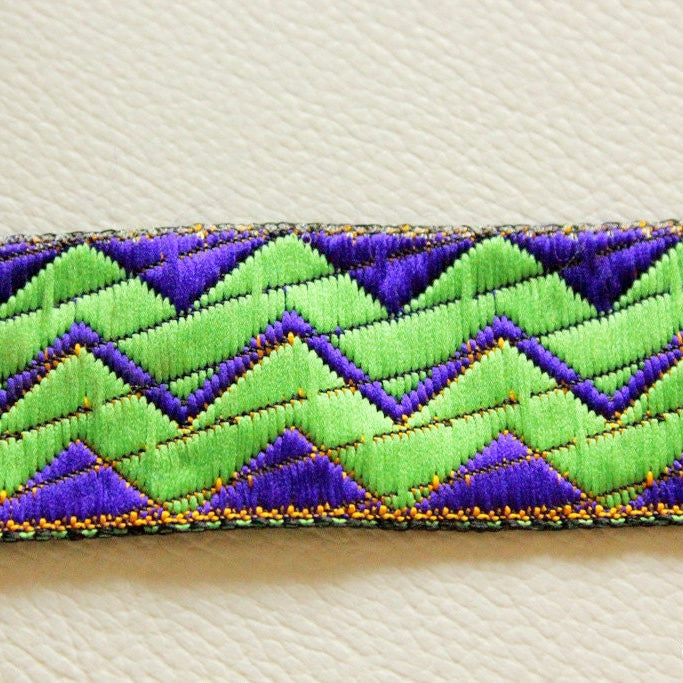 The embroidery on this trim is called Zardozi, an exclusive type of embroidery that is done by hand. Zardozi comes from two Persian words: zar or zarin meaning 'gold', and dozi meaning 'sewing'. Zardozi is a type of heavy and elaborate metal embroidery on a silk, satin, or velvet fabric base.