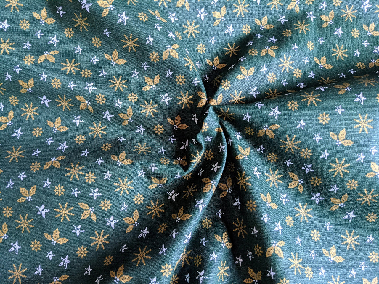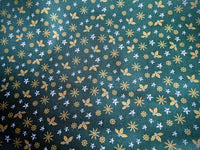 Green Cotton Holly Leaves Snowflakes Christmas Fabric, Festive Fabric, Holiday Fabric