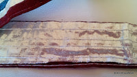 The embroidery on this trim is called Zardozi, an exclusive type of embroidery that is done by hand. Zardozi comes from two Persian words: zar or zarin meaning 'gold', and dozi meaning 'sewing'. Zardozi is a type of heavy and elaborate metal embroidery on a silk, satin, or velvet fabric base.