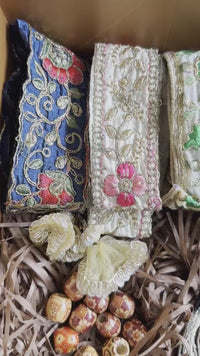 The embroidery on this trim is called Zardozi, an exclusive type of embroidery that is done by hand. Zardozi comes from two Persian words: zar or zarin meaning 'gold', and dozi meaning 'sewing'. Zardozi is a type of heavy and elaborate metal embroidery on a silk, satin, or velvet fabric base.