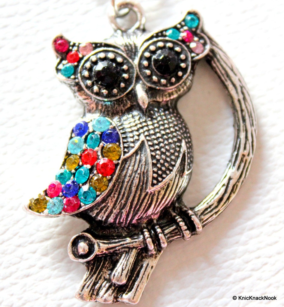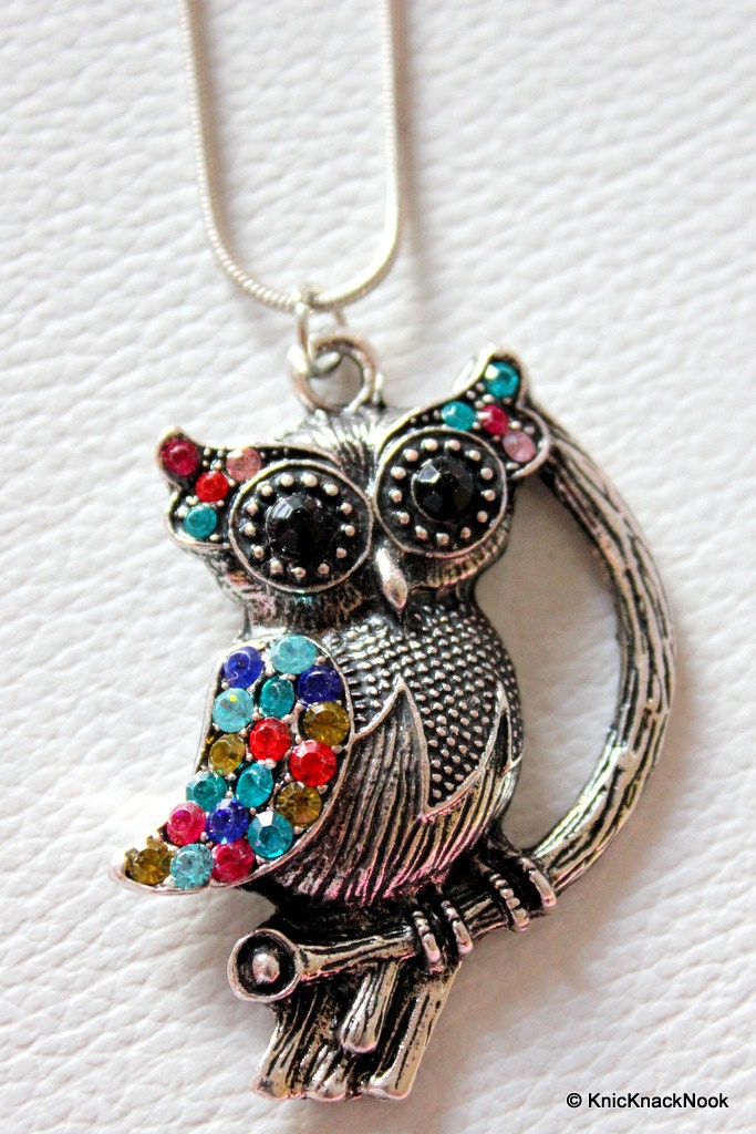 Silver Owl On Branch With Colourful Rhinestones Pendant