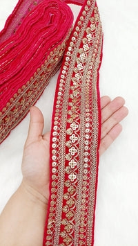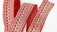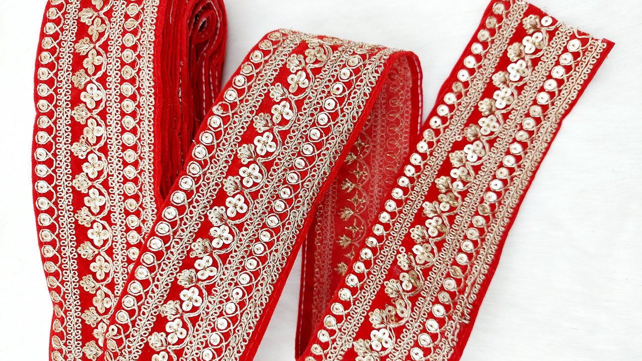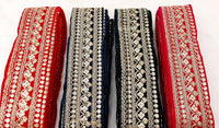 The embroidery on this trim is called Zardozi, an exclusive type of embroidery that is done by hand. Zardozi comes from two Persian words: zar or zarin meaning 'gold', and dozi meaning 'sewing'. Zardozi is a type of heavy and elaborate metal embroidery on a silk, satin, or velvet fabric base.