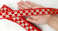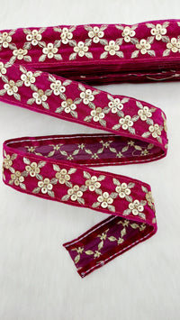 The embroidery on this trim is called Zardozi, an exclusive type of embroidery that is done by hand. Zardozi comes from two Persian words: zar or zarin meaning 'gold', and dozi meaning 'sewing'. Zardozi is a type of heavy and elaborate metal embroidery on a silk, satin, or velvet fabric base.