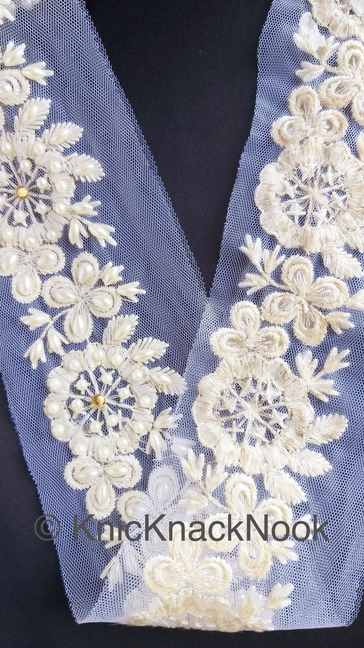 This listing is for a lovely White Pearl And Rhinestones Beads Net Lace Trim, Floral Trim, One Yard, Wedding Trim, Wedding Laces, Approx. 80mm Wide.